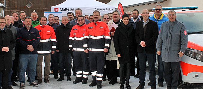 Gleich am ersten Tag, gab es den ersten Einsatz auf der Wasserkuppe. Rechtzeitig zur festlichen Inbetriebnahme, konnten das Notarztfahrzeug und seine Mannschaft,- trotz heftigen Schneefalls - aber am Standort präsent sein. Das „Hurra“ kam vom ersten Beigeordneten Frederik Schmitt (CDU). Er erinnerte daran, wie die Kreisverwaltung nach einem Ort gesucht hatte, an dem die notärztliche Versorgung für die Rhön gewährleistet werden könne. Zwar gebe es in der Region zehn Rettungswachen, aber bei der Notarzt-Versorgung, habe man bisher die gesetzliche 10-Minuten-Vorgabe nicht immer einhalten können. Malteser-Präsident Dr. Constantin von Brandenstein-Zeppelin zeigte sich begeistert, was die Malteser aus einer Ferienwohnung machen können. Er führte aus, dass die ärztliche Besetzung des NEF durch zwei festangestellte Notärzte, einen Pool an malteser-eigenen Honorarärzten und die Zusammenarbeit mit der Zentralen Notaufnahme des Klinikums Fulda, gesichert sei. Den Notärzten stehen Rettungsassistenten und Notfallsanitäter zur Seite. Die Teams wurden vom Malteser-Bildungszentrum Wetzlar auf ihre neue Aufgabe vorbereitet. Für die Notärzte gab es eine Einweisung auf die moderne Medizintechnik.