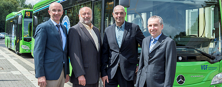 Über die Fortsetzung der erfolgreichen Verkehrspartnerschaft im Bergwinkel freuen sich (v. l.) VGF-Geschäftsführer Reiner Wunderlich, der Kreisbeigeordnete Matthias Zach, KVG-Geschäftsführer Volker Rahm und VGF-Geschäftsführer Thomas Lang.