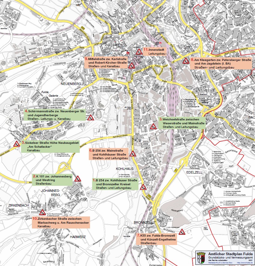 Auch im zweiten Halbjahr 2021 investieren die Stadt Fulda und Hessen mobil sowie die Versorgungsunternehmen und der Abwasserverband kräftig in die Infrastruktur in der Stadt Fulda – mit den entsprechenden Auswirkungen auf den Verkehr. Dabei sind die einzelnen Maßnahmen eng aufeinander abgestimmt und so getaktet, dass möglichst wenige Beeinträchtigungen für die Verkehrsteilnehmer entstehen. Dies betonten Fuldas Bürgermeister Dag Wehner und Stadtbaurat Daniel Schreiner bei der zweiten „Baustellen-Pressekonferenz“ 2021 im Kurfürstenzimmer des Stadtschlosses.