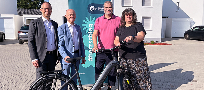 Freude bei der Übergabe des E-Bikes (von links): RhönEnergie-Geschäftsführer Dr. Arnt Meyer, OsthessenNetz-Geschäftsführer Andreas Bug sowie die Gewinner Olaf und Renate Hausmann. Foto: RhönEnergie