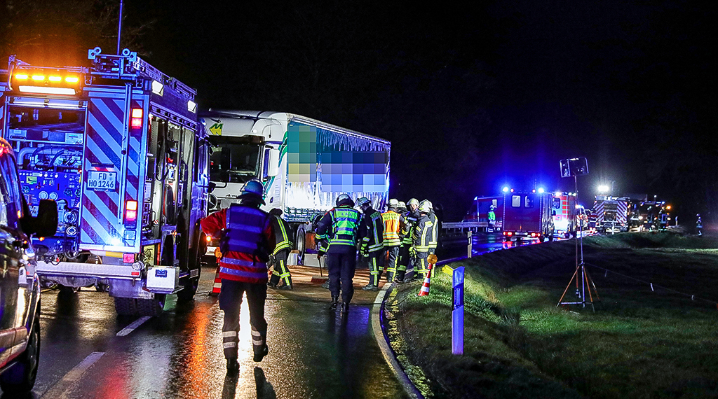 Vier schwerverletzte Personen gab es bei einem Unfall am Montagabend gegen 18 Uhr im Bereich des Ferienhofes Königsmühle bei Obernüst auf der L3174 zwischen Schwarzbach und Lahrbach. Ein aus Richtung Hofbieber kommender, mit einer 70-jährigen Dame besetzter Pkw geriet aus bislang unbekannter Ursache gegen 18 Uhr in einer langgezogenen Rechtskurve zunächst nach links in den Gegenverkehr und streifte dort einen Lkw mit Auflieger.