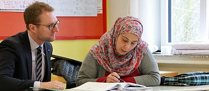 Lauterbach. 16 Männer und Frauen sitzen im Klassenzimmer, an vier Tagen in der Woche vormittags lernen sie gemeinsam mit ihren Lehrern Thomas Weise und Thomas Lindner. Die Lernenden des Deutschkurses auf dem Weg zum Sprachniveau B2 sind mittlerweile bei Kapitel 9 angekommen: „Digitale Welt“ lautet die Überschrift. Weil es der erste Kurs der Volkshochschule für berufsbezogene Deutschsprachförderung im Auftrag des Bundesamts für Migration und Flüchtlinge ist, sitzt diesmal Bildungsdezernent Dr. Jens Mischak für eine Schulstunde mit dabei. „Das ist beeindruckend und ganz schön anspruchsvoll“, so sein Kommentar.
