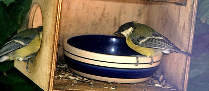 Frische Sonnenblumenmargarine mit Haferflocken und Sonnenblumenkerne ziehen bis zu 20 Meisen alltäglich an diese Futterstelle.