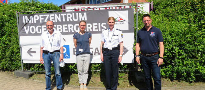 Die Impfungen der Polizistinnen und Polizisten, die im Kreisgebiet ihren Dienst tun, sind abgeschlossen – 119 Polizisten erhielten im Impfzentrum des Vogelsbergkreises ihre Schutzimpfung. „Die Impfaktion lief reibungslos und alle impfberechtigten Polizistinnen und Polizisten, die das Impfangebot wahrnehmen wollten, konnten geimpft werden. Nun sind wir mit der zweiten Runde durch“, resümiert Dr. Erich Wranze-Bielefeld, ärztlicher Leiter des Impfzentrums in der Alsfelder Hessenhalle. Zum Abschluss der Impfkampagne waren nun Katrin Gerlach und Nadine Renno von der Koordinierungsstelle Corona des Polizeipräsidium Osthessen in Alsfeld vor Ort, um sich für den einwandfreien Ablauf und die ausgesprochen gute Zusammenarbeit zu bedanken. Beim Vor-Ort-Termin erläuterte Michael Jahnel, Leiter der Organisation des Impfzentrums des Vogelsbergkreises, gemeinsam mit Dr. Erich Wranze-Bielefeld einige Eckpunkte zum Impfzentrum und dem organisatorischen Ablauf. +++