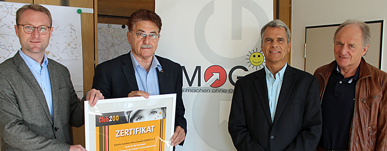 Viele Jahre war er bereits stabiler Kooperationspartner – jetzt ist der Vogelsbergkreis offiziell Mitglied geworden beim Verein SMOG e.V. (Schule machen ohne Gewalt). Unser Foto zeigt von links Ersten Kreisbeigeordneten Dr. Jens Mischak (Jugenddezernent), den 1. Vorsitzenden von SMOG, Erwin Maisch, sowie Gerhard Eurich und Werner Köhler (Beisitzer im SMOG-Vorstand). Foto: Erich Ruhl-Bady
