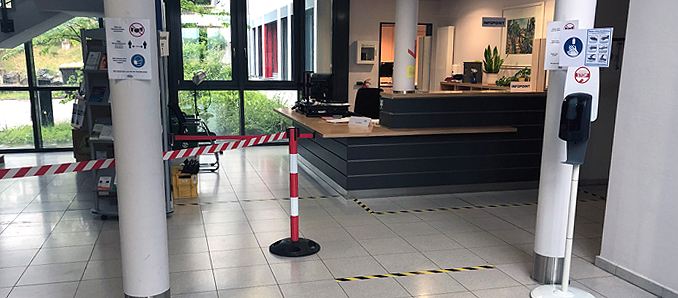 Klebemarkierungen auf dem Boden der Gebäude der Kreisverwaltung, Handdesinfektionsspender sowie Plexiglasscheiben sorgen für notwendige Sicherheit, sowohl beim Personal, als auch bei den Besuchern. Foto: Jennifer Sippel