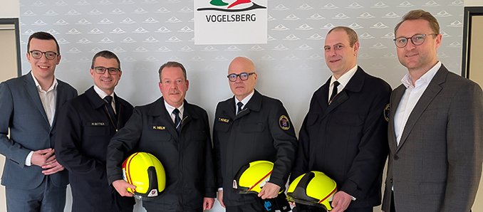 Landrat Dr. Jens Mischak (rechts) und der Erste Kreisbeigeordnete Patrick Krug (links) ernennen Kreisbrandmeister Hubert Helm (Dritter von links) zum stellvertretenden Kreisbrandinspektor sowie Tony Michelis (Dritter von rechts) und Mario Henning (Zweiter von rechts) für fünf weitere Jahre zu Kreisbrandmeistern. Auch Kreisbrandinspektor Marcell Büttner beglückwünscht die Feuerwehrexperten zur Ernennung.