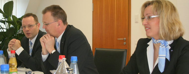 Die Vorstände der Volksbank Lauterbach-Schlitz, Norbert Lautenschläger und Alexander Schagerl, von links, konnten während der Bilanzpressekonferenz von einer positiven Geschäftsentwicklung in 2014 berichten. Marketingleiterin Kerstin Novy hatte erneut gute Organisationsarbeit geleistet.