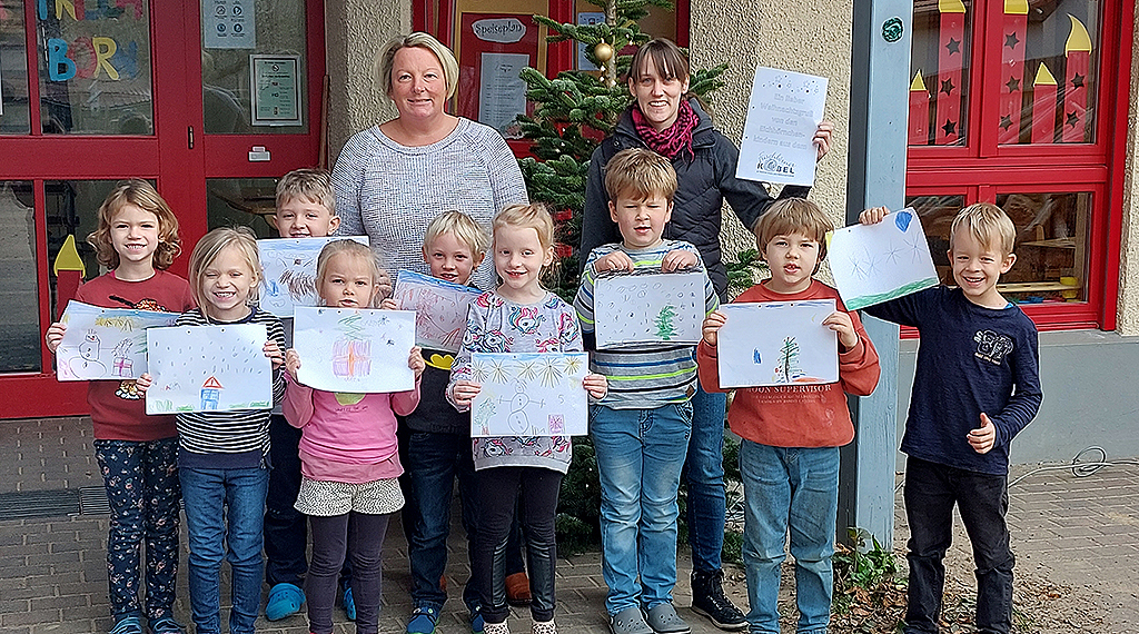 Die „Eichhörnchen-Kinder“ Maria, Greta, Fabian, Ida, Friedrich, Richard, Maximilian, Almira und Ben mit ihren Erzieherinnen Jessica Kratz und Nadine Hütter aus Frischborn sowie die „Strolchenclubkinder“ Sofia, Eleni, Freya, Sona, Maram und Arian mit Kita-Leitung Gabriela Deubel-Ziegler aus Lauterbach haben sich gemeinsam diese schöne Überraschung für all diejenigen einfallen lassen, die über die Weihnachtsfeiertage im Lauterbacher Krankenhaus das Bett hüten müssen und Corona-bedingt keinen Besuch empfangen können.