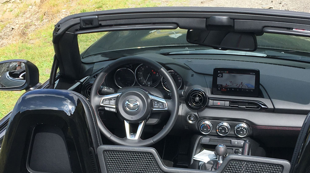 Aber die gekonnte Innenraumgestaltung in sportlich schwarzer Optik mit klassischen Rundinstrumenten mit guten Materialien in guter Verarbeitung nimmt der Mensch von heute ebenso gern hin. Bei diesem „Go-Kart“ ist inzwischen auch Luxus zuhause und eine Elektronik, die jede Lage im Griff hat – wenn nötig. Der aktuelle MX-5 wirkt erwachsener und passt zu den gehobenen Ansprüchen unserer Tage. Wer sein kleines Lenkrad mit dem dicken Lederkranz (jetzt in Höhe und Länge einstellbar) in die Hand nimmt und sich in dem bescheidenen Raumangebot für Fahrer und Beifahrer umschaut, der spürt, er sitzt in einem sicheren Auto. Doch nicht nur die Sportsitze werden ihn schließlich dazu verleiten, die Fähigkeiten auszuloten.