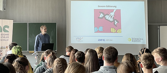 Etwa 100 Schülerinnen und Schüler sowie interessierte Kolleginnen und Kollegen folgten dem informativen und gelungenen Vortrag zum Thema „CRISPR-Cas – das Superwerkzeug für die Gentechnik“.