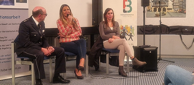 Mit ihrer Arbeit, betont sie, möchte sie den Opfern eine Stimme geben und zeigen: „Da kommt man wieder raus“. Sie ist ein Vorbild, da sie es geschafft hat, sich aus ihrer toxischen Beziehung zu lösen. Sie führt nun wieder ein glückliches Leben mit ihren Kindern und einem liebevollen Partner. Am Ende der Veranstaltung stehen neben Svenja Beck auch noch Wolfgang Keller als Opferschutzbeauftragter der Polizei und Klaudia Goerlich als Mitarbeiterin der Fachstelle gegen häusliche Gewalt des Vogelsbergkreises für Fragen zur Verfügung. „Es war eine gelungene Veranstaltung, mit der wir viele Menschen erreicht und zum Nachdenken bewegt haben“ freut sich Goerlich nach den zahlreichen, positiven Rückmeldungen aus dem Publikum. +++ pm