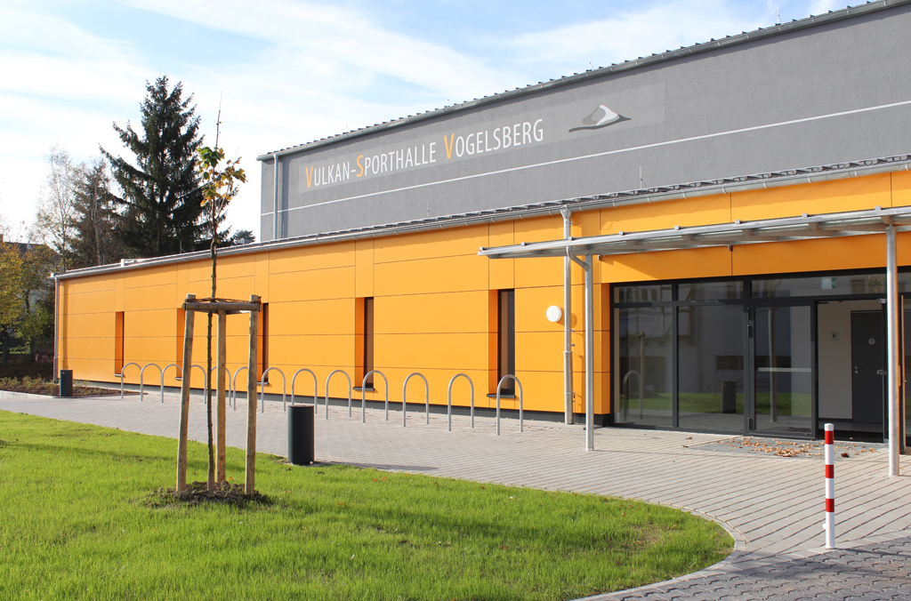 Ein leuchtender Anziehungspunkt mitten in der Stadt: die neue Vulkan-Sporthalle Vogelsberg.