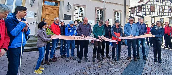 „Wandern und Segelflug“ - unter diesem Motto wurde am vergangenen Sonntag (23.04.) passend zum Beginn der Wandersaison in Gersfeld (Rhön) der „Segelfliegerweg Wasserkuppe“ eröffnet und wie hierzulande üblich, eingeweiht. Das schöne Wetter lockte 75 begeisterte Wanderinnen und Wanderer ins Rhönstädtchen. Die Tour startet am Bahnhof Gersfeld; dort findet sich auch die erste Informationstafel mit Informationen über den Bahnhof Gersfeld, den Vertrag über die Rhönbahnmodernisierung sowie über den ersten Rhönflug-Wettbewerb im Jahr 1920.