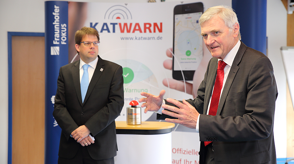 Das von Fraunhofer FOKUS entwickelte System, wird vom Fachdienst Gefahrenabwehr des Landkreises koordiniert und bedient. Die technische Plattform stellt die SV SparkassenVersicherung als Beitrag zum Gemeinwohl zur Verfügung. Arno Vetter von der SV Sparkassen-Versicherung ist sich sicher: „Wir sind ein regional verwurzeltes Unternehmen; Daher ist ein Engagement für die Menschen in diesem Landkreis selbstverständlich. KATWARN kann als Gemeinwohlbeitrag helfen, dohende Gefahren, Schäden und möglicherweise auch Leid zu reduzieren“, so Vetter. „Wir leben in einer Medien- und Informationsgesellschaft, KATWARN, als Modul der Warnmöglichkeit, gehört insofern heute einfach mit dazu“, erklärt Ortwin Neuschwandner von Fraunhofer FOKUS. KATWARN fungiert als kommunales Warnsystem; Für die Gefahreninformationen, bzw. deren Verbreitung, werden künftig Oberbürgermeister und Landrat, in Absprache mit den örtlichen Feuerwehren zuständig sein. Die Gesamtkosten für das neue Dialogsystem belaufen sich auf 45.000 Euro/10 Jahren, wovon 30.000 Euro vom Landkreis und 15.000 Euro vom Land Hessen hinzusubventioniert werden. Der Informationsdienst hatte sich bereits vor zwei Jahren erfolgreich etabliert. Alle weiteren Informationen zu KATWARN finden Sie auf: www.katwarn.de.