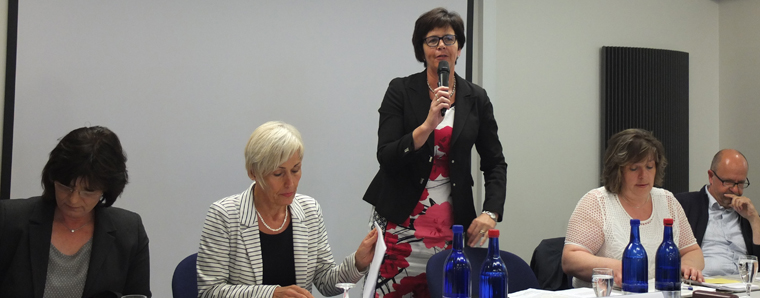 Breiten Raum nahm die mögliche Reform der Ausbildung in den Pflegeberufen ein. Unter der Moderation von Birgit Kömpel diskutierten neben Bettina Müller auch Dr. Jürgen Eierdanz, Altenpflegeschulenleiter bei der AWO Hessen Nord, Monika Mühlhausen, Pflegedirektorin im Gama Altenpflegezentrum Bebra, und Susanne Dörr, Schulleitung Altenpflege BBZ Mitte, über eine Generalisierung der Ausbildung. Diese sieht vor, die Bereiche Alten-, Kranken, und Kinderkrankenpflege zu verbinden, so dass Pflegekräfte künftig in allen drei Bereichen ausgebildet werden und dann entsprechend auch arbeiten können. „Wir möchten eine einheitliche Berufsbezeichnung und den Wünschen vieler junger Menschen gerecht werden, die Sektorenübergreifend arbeiten wollen“, erklärte Bettina Müller, die aber darauf hinwies, dass der Gesetzesentwurf sich verzögere und noch einiges „im Fluss“ sei.