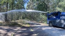 Eine weitere Anforderung an die Hünfelder Bundespolizeiabteilung erfolgte dann am Freitag aus der Bundeshauptstadt Berlin. Auch hier entwickelte sich ein Flächenbrand auf einem Spreng- und Versuchsplatz der Kampfmittelbeseitigung im Berliner Grunewald. Das Gelände im unmittelbaren Gefahrenbereich konnte nur durch den Einsatz von Löschrobotern und Löschpanzern bekämpft werden. Eine weitere Hünfelder Wasserwerferbesatzung konzentrierte sich auf den Transport von Löschwasser zu den Entnahmestellen sowie auf das Ablöschen von Brandherden, die sich durch die Umsetzung von Munitionsresten im Grunewald ausbreiteten. Der Kommandant der Hünfelder Kräfte übermittelte an den Abteilungsstab: „Auf dem Spreng- und Versuchsplatz herrschen Temperaturen von bis zu 700 Grad Celsius, sodass eine latente Explosionsgefahr besteht. Das Gebiet kann derzeit nicht betreten werden. Wir haben bisher 180000 Liter Wasser aus unserem Wasserwerfer abgegeben.“ +++ pm