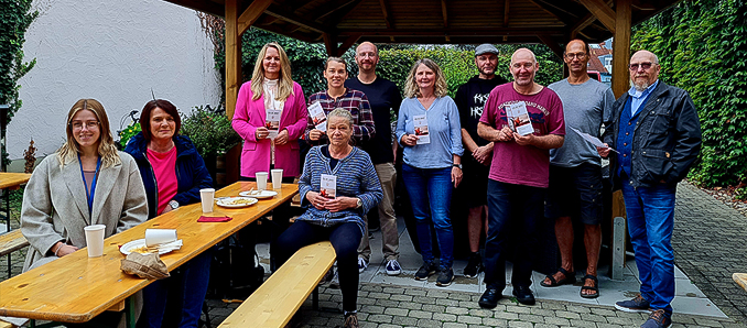 Die Nummern wurden auf den Fuldaer Stadtplan übertragen, der ebenfalls ein Teil des Wegweisers ist. Die Idee zum Wegweiser, der als Flyer herausgegeben wird hatte Ulrike Siuda, Mitarbeiterin der Integrierten Wohnungslosenhilfe Haus Jakobsbrunnen der Caritas. Sie hat auch die ansprechende Gestaltung übernommen. Im Rahmen des nachgeholten Grillfestes der Teams von Haus Jakobsbrunnen und der Tagesstätte für Abhängigkeitserkrankte (CMA), das von der Metzgerei Paul unterstützt wurde, übergab Ulrike Siuda die Erstausgabe des Flyers an Caritas-Geschäftsführerin Susanne Saradj und ihren Stellvertreter Werner Althaus.