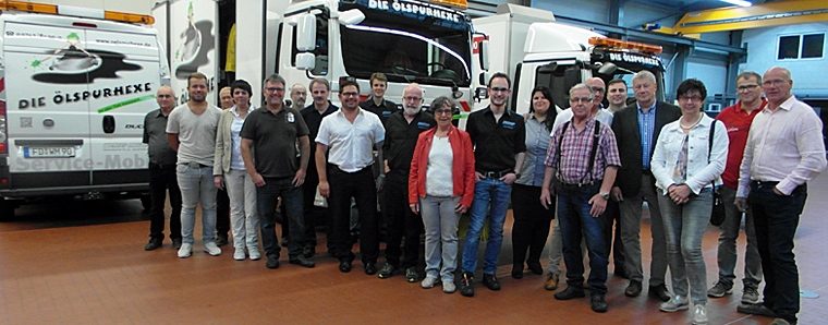 Einsatzbereite Ölspurhexen mit den Mitgliedern der MIT und den Betriebsinhabern Hannelore Wehner(Mitte), Ehemann Rudolf (links) und Sohn Boris (rechts)