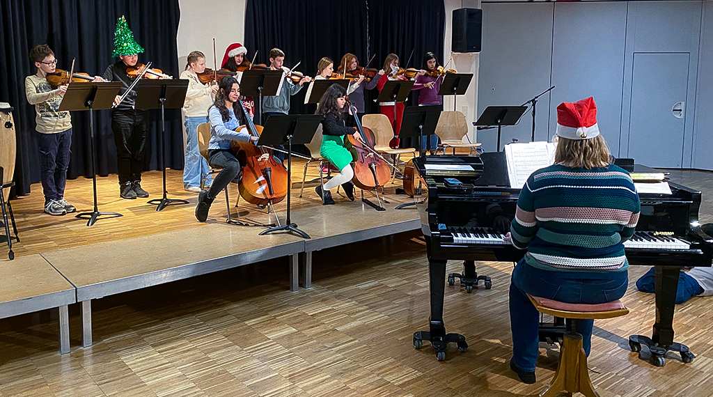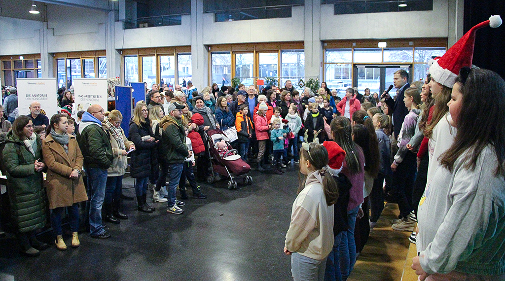 Die Schülerinnen und Schüler der G5d lernten bei ihrem Klassenlehrer Sebastian Graf, wie man Kerzen zieht. „Dafür musste ein Docht bis zu 50 Mal in Bienenwachs getaucht werden. Das Ergebnis waren 96 Kerzen in unterschiedlicher Form und Größe“, berichtet er stolz. Klassenlehrerin und Gymnasialzweigleiterin Cornelia Handke bastelte Futterstellen für Vögel mit ihrer Klasse G5c. Der stellvertretende Schulleiter Arne Stückradt hieß alle Gäste im AudiMax willkommen. Mit traditionellen und modernen Weihnachtsliedern eröffneten die „Young Voices“, der Chor der fünften und sechsten Klassen, unter der Leitung der Musiklehrerinnen Anne Rill und Silke Pfannkuch den Adventsbasar im AudiMax und luden alle Gäste anschließend zu einem Konzert in die Aula ein. Dort präsentierten auch die Bläser- und Streicherklasse unter der Leitung von Tatjana Beyer und Lorena Farnung ihr musikalisches Können vor großem Publikum. Im AudiMax erwartete die Gäste ein bunter Weihnachtsmarkt, bei dem Schülerinnen und Schüler Basteleien und Leckereien zum Kauf anboten. Die Klasse G6b und Klassenlehrerin Pia Meyer luden zum Basteln vor Ort ein, beim „Flohmarkt“ der Klasse G5a konnten die Gäste am Glücksrad drehen.