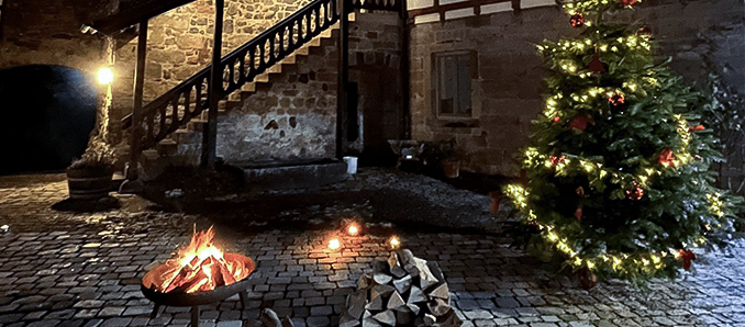 Auch im Dezember feierte die Akademie der Erwachsenenbildung ihr 70-jähriges Bestehen mit einer besonderen Veranstaltung: In dicke Jacken gehüllt, folgten am Sonntagabend zahlreiche Gäste der Einladung auf den Burghof, um gemeinsam mit dem Orchesterverein Eiterfeld zwei Stunden weihnachtlichen Klängen und Geschichten zu lauschen sowie den Duft von selbstgemachtem Pfefferkuchen und Glühwein zu genießen. Hartmut Piekatz, Leiter der Hessischen Heimvolkshochschule, begrüßte die Anwesenden auf dem prächtig illuminierten Gelände der Burg, wo Feuerschalen und ein geschmückter Weihnachtsbaum Wärme spendeten. Der Orchesterverein Eiterfeld unter Leitung von Patrick Giebel spielte in voller Besetzung eine Auswahl weihnachtlicher Stücke angefangen von der „Pfingstrose“ über Klassiker zum Mitsingen, wie „Alle Jahre wieder“. Piekatz und Matthias Feuerstein, Programmbereichsleitung für Gesellschaftspolitische Bildung, gaben einige adventliche Geschichten zum Besten und die Burgküche lud zum gemütlichen Beisammensein in den Wintergarten, wo die Gäste bei Punsch und Gebäck noch länger zusammensaßen. „Wir hatten das ganze Jahr über zum Jubiläum verschiedene Events gehabt, darunter Feste oder Konzerte. Nun zum Jahresende war die Idee entstanden, in diesem Rahmen nochmal einen eher besinnlichen Ausklang mit den Menschen aus nah und fern zu suchen“, resümiert Piekatz. Die Akademie wird sich auch im nächsten Jahr wieder mit verschiedenen Veranstaltungen für die Menschen in der Region öffnen. +++ pm
