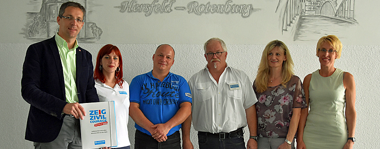 Landrat Dr. Michael Koch (li.) im Landratsamt mit Mitarbeitern des "Weißen Rings": Das sind von links nach rechts Anne Burhenn, Kay Gerden, Fritz Eckhardt, Irke Ursprung und Annett Merrath.