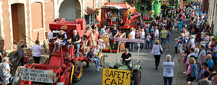 Wie in jedem Jahr unterbrachen die Landwirte ihre Arbeit und putzten ihre Maschinen gegen Mittag heraus, dabei demontierten sie zur Sicherheit auch die Mähwerke und ersetzten diese gegen Podeste. Die ideale Mitfahrgelegenheit für Kinder und Begeisterte war so garantiert. Jedes Kind konnte auf einem der Erntekolosse mitfahren, zudem gab es Ansteckbuttons mit Mähdreschern geschenkt. Im Anschluss der Parade entwickelte sich auf dem Platz vor dem Dorfgemeinschaftshaus ein wahres Volksfest. Gegrilltes und kühle Getränke wurden dort bis in die späten Abendstunden angeboten, zudem gab es Milcheis. Auch das Fahrerlager der Blinklichtmähdrescherfahrer war an dieser Stelle aufgeschlagen, eine umgebaute Zapfanlage mit einem Mähdrescher war dort auch in diesem Jahr der „Hingucker“. +++ pw