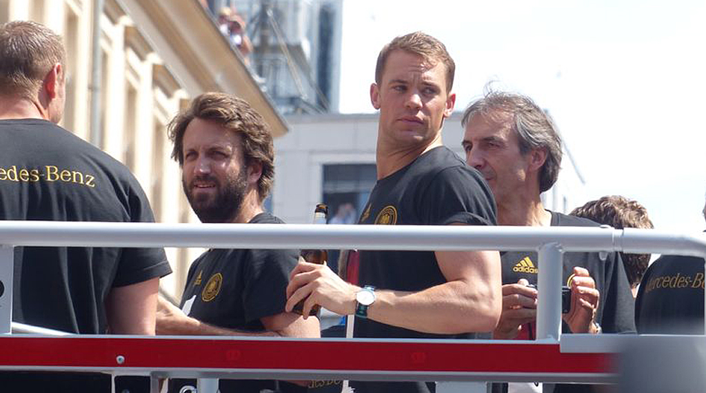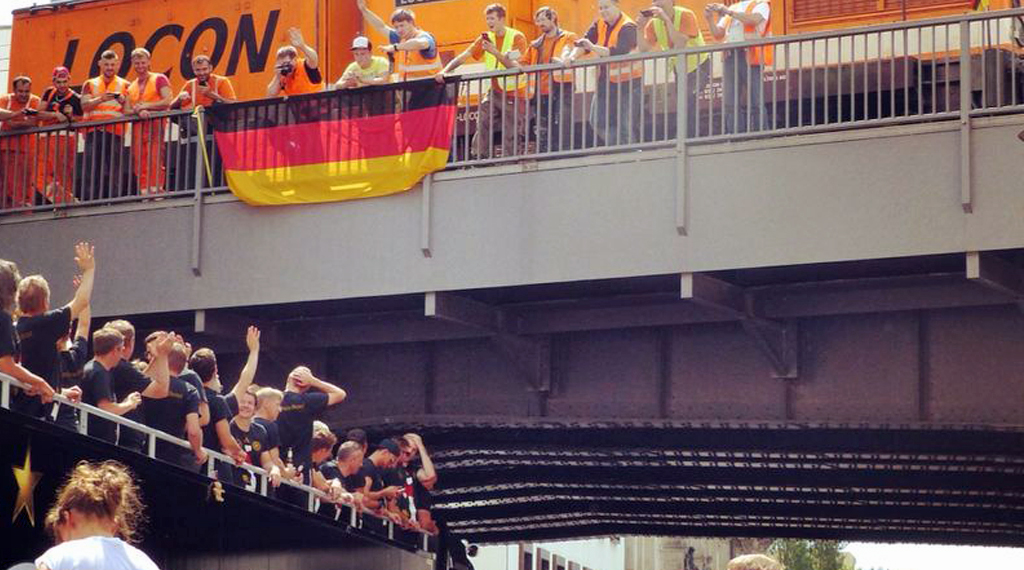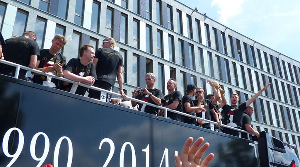 Nach der Landung in Berlin-Tegel bestieg die Mannschaft Busse, die die frischgebackenen Fußball-Weltmeister zur Fanmeile am Brandenburger Tor bringen sollen. Die Mannschaft von Bundestrainer Löw war erst mit zweistündiger Verspätung aus Rio de Janeiro abgeflogen, da der „Fanhansa Siegerflieger“, mit dem der DFB-Tross die Heimreise antrat, nach einem Zusammenstoß mit einem Gepäckwagen einen Lackschaden aufwies und einer Sicherheitskontrolle unterzogen werden musste. Durch den verspäteten Abflug muss auch die geplante Siegesfeier am Brandenburger Tor nach hinten verschoben werden: Sie soll nun gegen Dienstagmittag stattfinden. Am Brandenburger Tor waren bereits bei der Landung weit über 100.000 Fans des DFB-Teams, die zusammen mit der Nationalmannschaft den Titel-Coup in Brasilien gebührend feiern wollen.