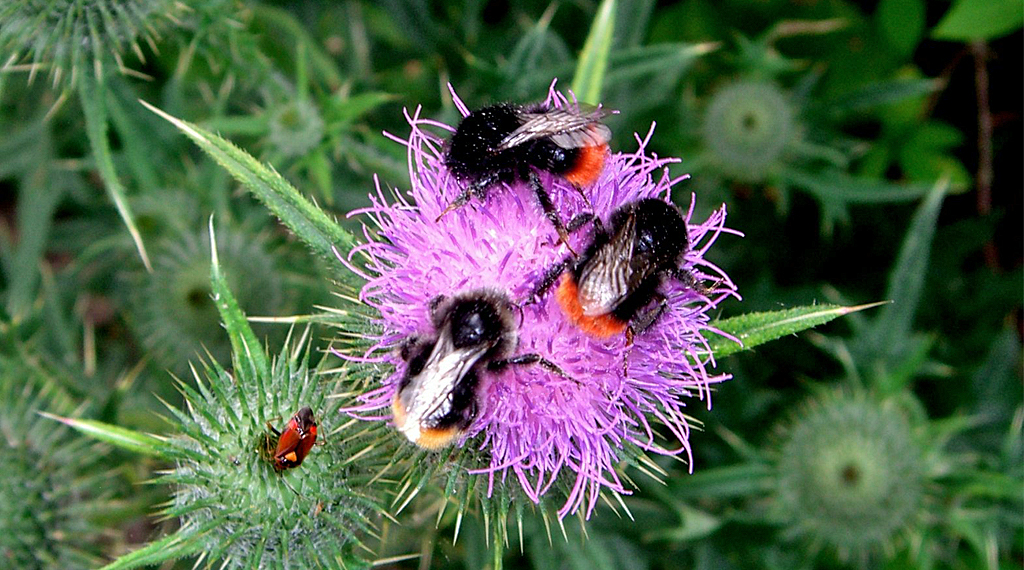 Selbst eine Wegranddistel im Garten, kann einem schöne Motive bescheren. Gleich drei Erdhummeln und eine Bodenwanze hatten sich darauf eingefunden. Die Wegranddistel wird besonders gerne vom Kaisermantel-Schmetterling aufgesucht.