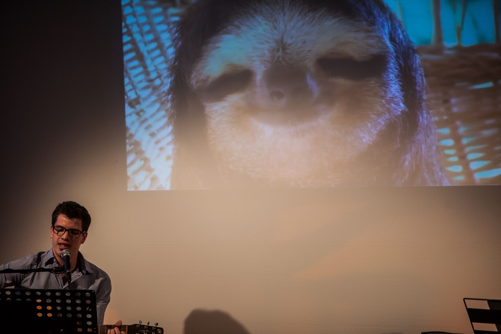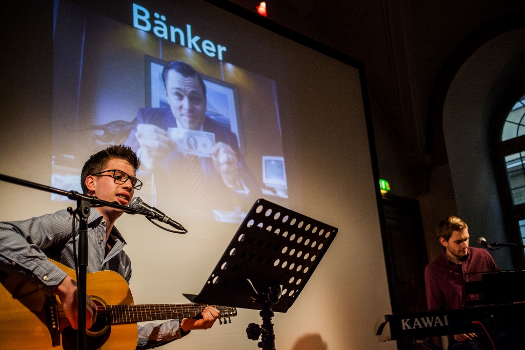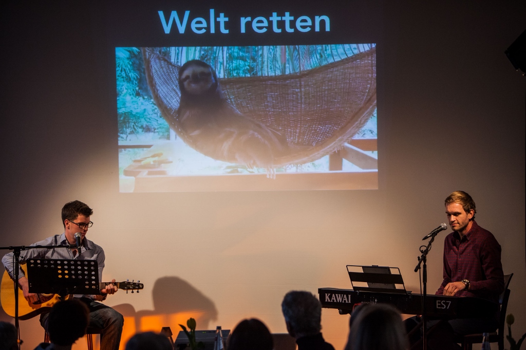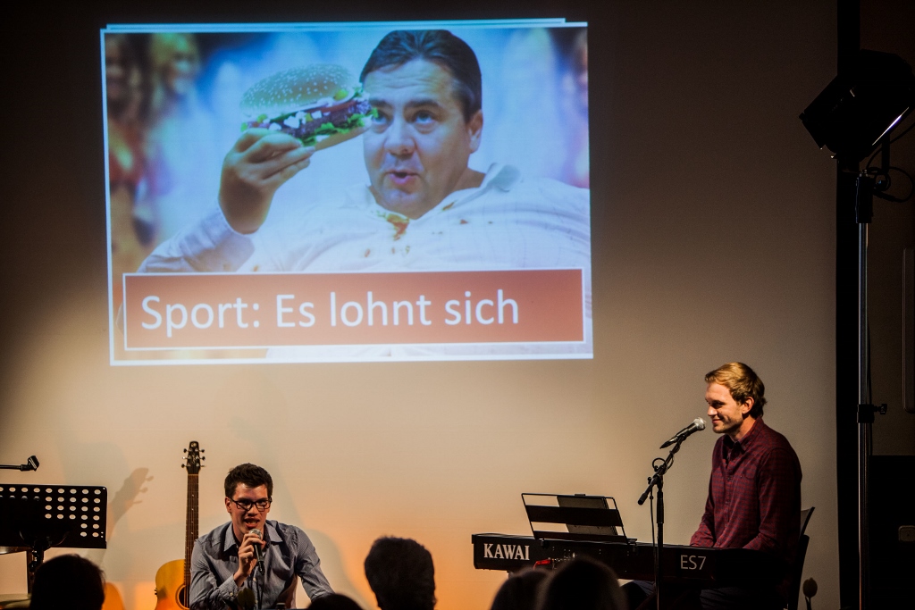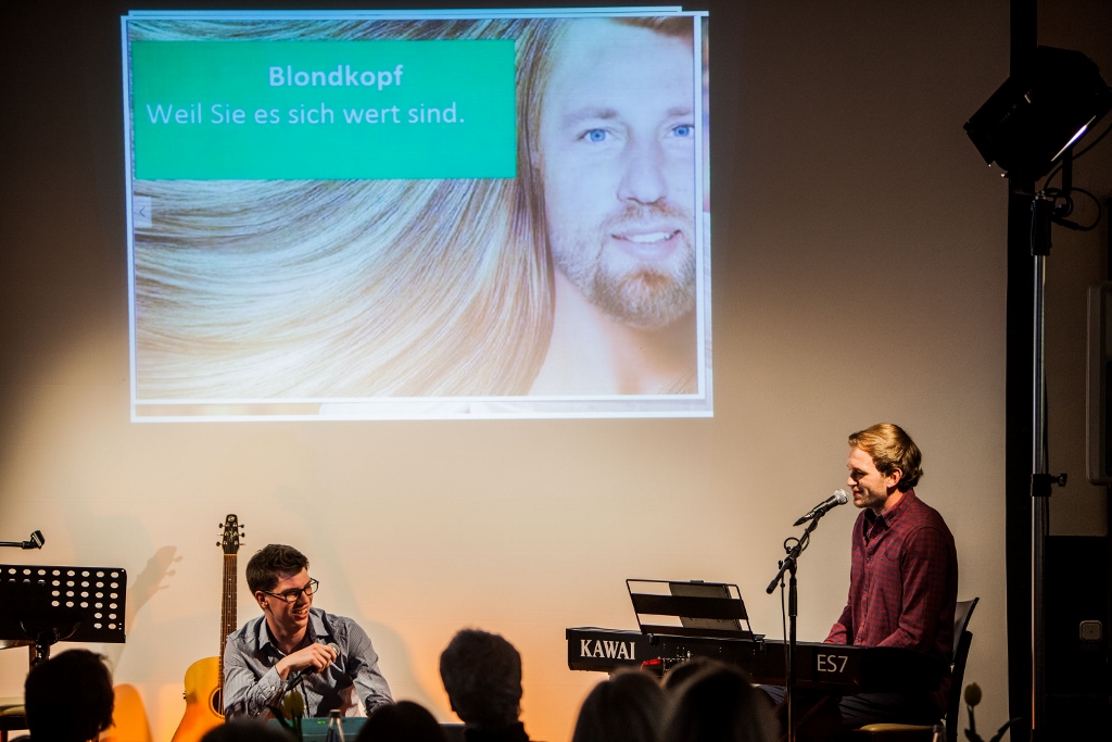 Johannes Gebhardt und Linus Vogel heißen „Jojo+Linus“ mit vollen Namen. Sie kennen sich seit ihrer Banklehre. Dass man ausgerechnet ins so einem trockenen und eher für Diskretion bekannten Milieu einen Partner zur öffentlichen Aufführung von Comedy findet, ist ungewöhnlich, und dass man seine Bühnenambitionen auch danach noch weiter auslebt, obwohl der eine Wirtschaftsinformatik und der andere BWL studiert, das ist bemerkenswert und sicher nicht konform einer üblichen Karriereplanung in der Branche. Allerdings mag es auch als Erklärung dienen, warum Jojo+Linus gerade ihr Song „Bänker“ besonders gut gelungen ist. Sie haben hier wohl zur Freude des Publikums Insider-Wissen abgeschöpft. Überhaupt sind die beiden immer dann besonders lustig, wenn sie böse werden, wie z.B. auch bei dem Lied „Sie fährt“, das die Leiden eines alkoholisierten Beifahrers beschreibt, wenn seine Freundin das Steuer übernimmt. Man wünscht sich direkt mehr Lieder und Textanteile von dieser Sorte, doch gestehen wir dem Duo auch Welpenschutz zu. Sie haben noch viel zu lernen, zeigen aber durchaus auch jetzt schon einiges Potential und Talent, um das Publikum mitzureißen. Wir werden sie auf jeden Fall weiter beobachten und sind gespannt auf ihre zukünftigen Auftritte.