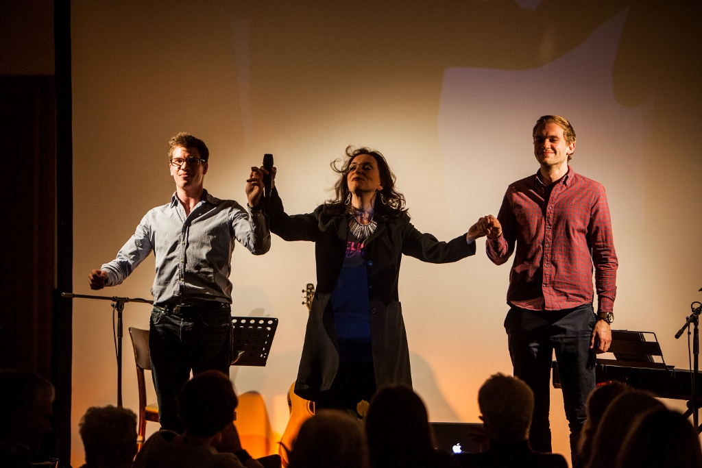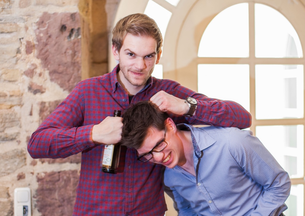 Fulda. Von weit entfernten Städten (Mainz und Leipzig) sind sie in ihre alte Heimat Fulda angereist. Oft sehen sie sich über lange Zeit nicht, doch dass sie sich blendend verstehen, das merkt man gleich. Die Chemie stimmt zwischen den beiden Comedians, die am letzten April-Mittwoch ihre neue Show mit dem treffenden Titel „Freundschaft Plus“ im Rahmen der bekannten Dinner-Show im voll besetzten Museumscafé präsentiert haben. Der Titel ist Programm, so drehen sich die Themen der Lieder und Dialoge im Wesentlichen um das, was Leute in den 20ern beschäftigt: das Studium z.B. oder wie man es aufschiebt (in dem Lied „Ich muss erst noch die Welt retten), Partys – inklusive Nachdurst und seltsamer Katergelüste (wie in dem Song „Chistels Mett“), aber auch frühe Elternschaft (wie in dem Song „Daddy“), die Diskussionen um das Schmähgedicht von Jan Böhmermann (verarbeitet in einem romantischen Gedicht an Erdogahn) oder das, was besonders Jojo in Leipzig bei den Aufmärschen der „Legida-Bewegung“ jeden Montag in Leipzig an rechter Hetze erlebt, findet seinen Niederschlag. Als die beiden – unterstützt von der Gastgeberin Marianne Blum – das Ärzte-Lied „Arschloch“ intonieren ernten sie viel Beifall bei dem Fuldaer Publikum.