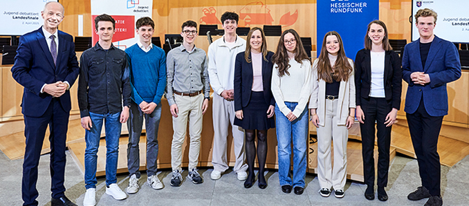 In den Jurys beider Debatten waren mit Alina Eckert, Justin Gesellchen, Maximilian Schon, Jakob Schwed und Annika Seuring ehemalige Landes- und Bundessiegerinnen und -sieger vertreten. Darüber hinaus gehörte Ute Wellstein, Leiterin des hr-Landtagsstudios, sowie die Projektlehrerin Frauke Stock zur Jury. Für die musikalische Begleitung sorgten das Orchester des Goethe-Gymnasiums Frankfurt unter der Leitung von Dr. Felix Steiner sowie Tilman Jerrentups Gesangsensemble „Frauenzimmer“ der Diltheyschule Wiesbaden. Beschäftigte des Bereichs Politische Bildung des Hessischen Landtages informierten über verschiedene Bildungs- und Informationsangebote des Parlaments, und Dr. Christian Maatje stellte den „Creator Room“ vor, das neue Medienkompetenz-Studio des Hessischen Rundfunks. +++ pm