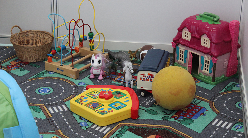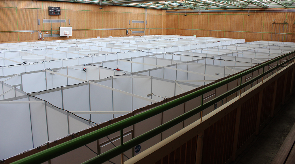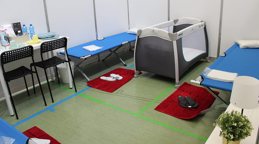 Die Turnhalle ist groß genug für viele kleine Wohneinheiten, die alle mit abschließbaren Türen ausgestattet sind. Eine Wohnkabine enthält in der Regel drei Feldbetten, ein Kinderbett, einen kleinen Tisch und zwei Stühle – das sind die wichtigsten Einrichtungsgegenstände. Auf roten Matten liegen Badeschlappen bereit, auf dem Tischchen befindet sich eine Erstausstattung mit Produkten zur Körperpflege – auch für Babys ist etwas dabei. Zur Verfügung stehen Stromanschlüsse und ein Zugang zu W-Lan. Außen sind die Wohnkabinen mit Nummern gekennzeichnet. In Kabine 1/01 befindet sich ein Spielzimmer, das schon an der Außentür liebevoll mit kleinen Stofftieren behängt ist. Hier sollen Kinder, die vor den Schrecken des Krieges in Sicherheit gebracht wurden, einfach für eine Weile wieder Kind sein dürfen. Neben kleinen Tischen und Stühlen, Malsachen und einem Spieltunnel gibt es unter anderem ein kleines Puppenhaus und eine Mini-Werkzeugbank.