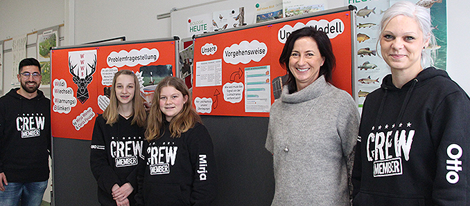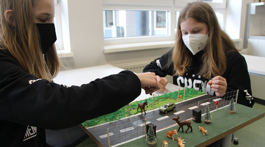 Fünf Prozent der Verkehrsunfälle sind Wildunfälle, fanden Mirja und Carla heraus. Dabei werden jedoch nicht nur Tiere verletzt oder getötet, sondern auch Menschen sind in Gefahr. „Das Problem gibt es schon lange, aber Lösungen dafür sind bisher offensichtlich wenig nützlich“, finden sie. „Wir haben überprüft, mit welcher Technik wir die Tiere am besten schützen und Autofahrer warnen können“. Dazu kamen sie mit zahlreichen Lehrern ins Gespräch und sammelten sie Vor- und Nachteile von Bewegungsmeldern, Wärmebildkameras und Lichtschranken. „Ich fand es bemerkenswert, dass die Mädchen selbst mit ihrer Idee auf uns zugekommen sind und dass sie so akribisch an ihrem Projekt gearbeitet haben“, freut sich Lehrer und AG-Leiter Özgür Kutluay. „Die Zielstrebigkeit und Verlässlichkeit von Mirja und Carla ist nicht selbstverständlich für Schüler in ihrem Alter“, findet auch AG-Leiterin Nina Marlen Otto.