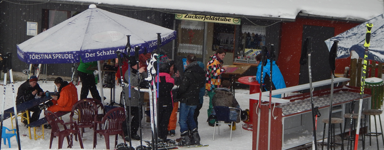 "Die bei uns verwendeten Lebensmittel stammen alle aus regionaler Produktion", sagt Jörges. Neben dem Angebot in der Zuckerfeldstube gibt es für den schnellen Hunger zwischendurch noch eine Grillhütte im Außenbereich, und an der Schneebar können sich die Wintersportler mit heißen und kalten Getränken versorgen. Beim Après-Ski unter den großen Schirmen, die vor widrigen Wetterbedingungen schützen sollen, treffen junge Snowboarder auf eingefleischte Skifahrer, und man kommt miteinander ins Gespräch. Skibegeisterte Familien aus dem Rhein-Main-Gebiet mischen sich mit Einheimischen und immer wieder hört man fremde Sprachen auswärtiger Gäste. Insbesondere Holländer lieben das meist nebelfreie Skigebiet, die beschauliche Atmosphäre an der Zuckerfeldstube, den freundlichen Service, das gute Preis-Leistungs-Verhältnis, den kostenlosen Parkplatz und die einmal wöchentlich stattfinden-de, abendliche Skiparty.