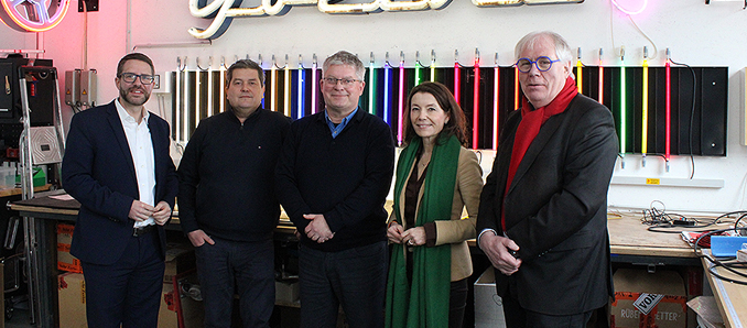 Der Name klingt nach den Anfängen der Lichtwerbung – und genau dort liegen auch die Wurzeln von Neon Zentgraf. Doch was einst mit klassischer Neonreklame begann, hat sich in 75 Jahren Unternehmensgeschichte grundlegend gewandelt. „Neon ist heute nur noch ein kleiner Teil unseres Produktportfolios“, erklärten die Geschäftsführer und Brüder Klaus und Dirk Zentgraf bei einem Besuch von Landrat Thorsten Stolz, Maintals Bürgermeisterin Monika Böttcher und dem Ersten Stadtrat Karl-Heinz Kaiser auf dem Firmengelände in Maintal-Hochstadt. „Wir haben frühzeitig auf LED-Produkte umgesattelt und die Chancen erkannt, die in dieser Technologie stecken.“