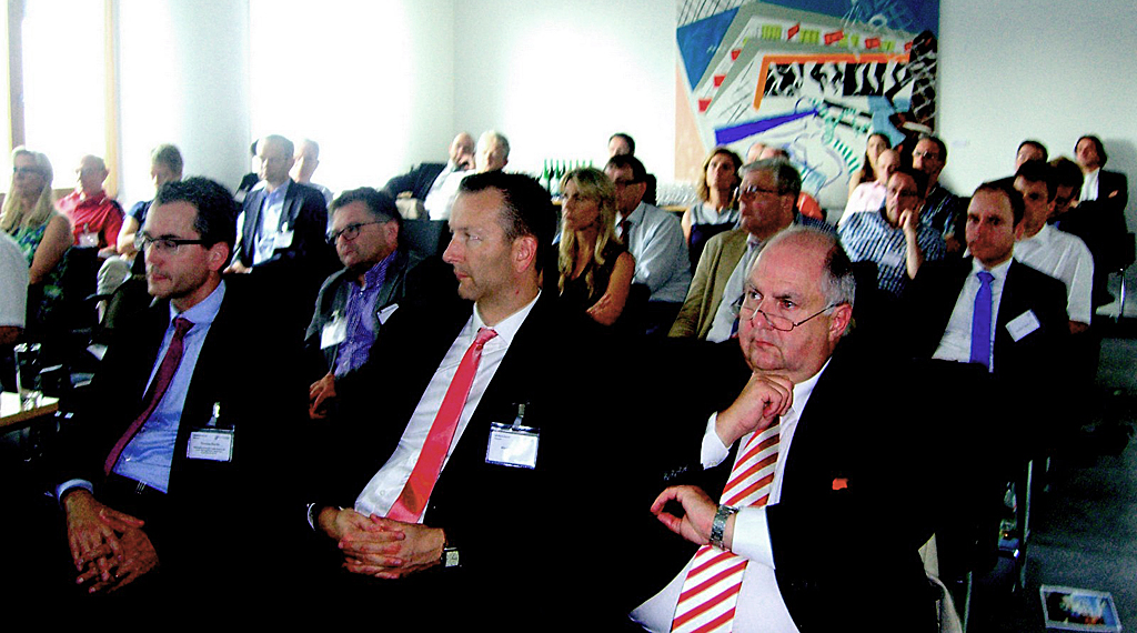 Von weit her waren zahlreiche Gäste angereist. Mattias Schäfer der Geschäftsführer der Deutschen Bank, zweiter von rechts, und dritter von rechts,  Thomas Eberle von der deutschen Bank, Referent zum Thema Außenhandel.