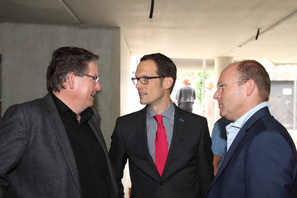 Nicht nur optisch, auch im Hinblick, auf das Leben in der Stadt, wurde ein Konzept entwickelt, das städtisches Wohnen, zu besten Bedingungen ermöglicht. „Jede Wohnung, verfügt bei Bedarf über einen eigenen Tiefgaragenstellplatz, der über Aufzüge – direkt zu den Wohnungen führt“, erklärt Bauherr Moritz Staubach. Ebenfalls in der Konzeption von Bedeutung, war die Schaffung von Außenplätzen: „Jede Wohnung verfügt über einen Balkon oder eine Terrasse, und trotzdem, haben wir einen Innenhof geschaffen, der gemeinsam oder alleine, genutzt werden kann.“ Dass dieses Konzept, des lebenswerten Wohnraums in der Innenstadt, aufgeht, zeigt sich nicht zuletzt in der bisherigen Veräußerung der Eigentumswohnungen. „Aktuell stehen noch zwei Wohnungen zur Verfügung, die im Rohbau auch schon besichtigt werden können“, so Moritz Staubach weiter. Wohnungskäufer, wie Anwohner – außerdem Alois Früchtl, Vorstandsvorsitzender der Sparkasse Fulda und Dr. Gregor Stasch, ehemaliger Leiter des Vonderau Museums, wohnten dem gestrigen Richtfest bei. +++ fuldainfo | jessica auth