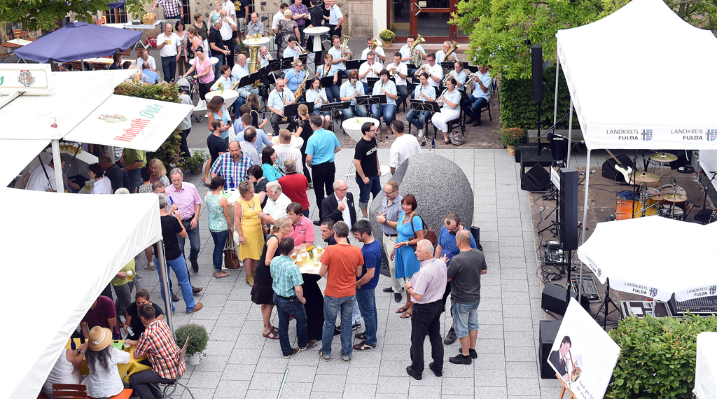 Trotz Urlaubszeit war im Innenhof des Kreishauses eine große Zahl von Mitarbeiterinnen und Mitarbeitern zusammengekommen, um ihrer persönlichen Verbundenheit mit Heiko Wingen-feld Ausdruck zu verleihen, der sich seinerseits für eine „wunderbare Zeit“ bedankte. Als dann der scheidende Erste Kreisbeigeordnete die vielen Hände geschüttelt hatte, konnte dem Wunsch aller Beteiligten nach einer Abschiedsfete, bei der es nicht förmlich-offiziell, sondern gesellig-unterhaltsam zugehen sollte, in vollem Umfang entsprochen werden.