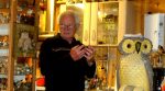 Sicher liegt seine Leidenschaft nicht darin begründet, dass dieses Tier auch in einigen Ländern als „Vogel der Weisheit“ verehrt wird, sondern weil ihn die vorwiegend nachtaktiven Beutegreifer bereits in seiner Kindheit und während vielfältiger Beobachtungen in ihren Bann gezogen haben. Hatte er sich anfangs mal das eine oder andere Stück aus Porzellan, Holz oder anderen Stoffen käuflich erworben, so hat ihn die Sammelleidenschaft seit 1980 so richtig gepackt, als er seiner Lebensgefährtin in Bensheim, der bekannten Eulenstadt, einen ersten Besuch abgestattet hatte. Waren es bei einem unserer Besuche in Bad Salzschlirf vor etwa sieben Jahren 2.600 Exponate, in der Größe von wenigen Millimetern bis zu einem Meter, auf die der Sammler stolz war, so sind es inzwischen etwa 10000 Eulen, die er in Bad-Salzschlirf zusammentragen konnte. Hatten seine Lieblinge anfangs noch Platz in den Wohnräumen gefunden, so hat Wolfgang Nusko ihnen jetzt Raum im selbst erbauten Freizeit-Holzhaus im eigenen Garten geschaffen, wo sie in Vitrinen auf Regalen oder auch auf Bäumen und Pfählen in seinem steten Blickfeld ruhen und auch seine Freunde und Gäste begeistern und erfreuen. Dass er ein guter Gastgeber ist, versteht sich von selbst, dass er uns bei einer Tasse Kaffee auch noch mit Servietten und anderem Zubehör, auf denen Eulen zu sehen sind, das sorgte für weitere Begeisterung über die großartige Sammlung. Es ist dies nicht der erste Bericht von Wolfgang Nuskos großer Sammlerleidenschaft in einem Medium, unter anderem wurde in der Vergangenheit auch schon im Rundfunk davon berichtet.