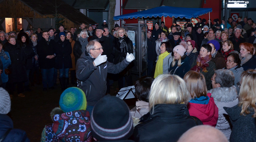 Musikalisch umrahmt wurde die Silvesteransprache von der Stadtkapelle Hünfeld und Sängerinnen und Sängern des Kirchenchors St. Jakobus Hünfeld, des Ökumenischen Singkreises Hünfeld, des Männergesangvereins Hünfeld, des Gesangvereins Mackenzell und des Gesangvereins Nüst. Die Gesamtleitung hatte in diesem Jahr Walter Glotzbach. Mit dem Hünfelder Neujahrslied verabschiedeten die Musiker das alte Jahr und hießen das neue willkommen. Die Tradition geht bereits auf das 19. Jahrhundert zurück, als das Lied von Hünfelder Handwerksmeistern in der Silvesternacht auf dem Rathausdach gesungen wurde. Die Freiwillige Feuerwehr der Stützpunktfeuerwache Hünfeld versorgte die zahlreichen Gäste mit Getränken, um auf das neue Jahr anstoßen zu können. +++ vw