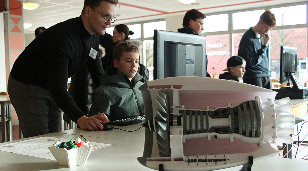 „Herzliche Willkommen an der GSO“ begrüßte eine bunte Buchstabenkette die Gäste am Eingang des Schulgebäudes. In der Pausenhalle gab es frisch gebackenen Waffeln, einen Stand der Imker AG, Informationen zu den Musikklassen und Vorführungen der Schulsanitäter. Balanceboards und eine Slackline, die an der GSO zur „bewegten Pause“ gehören, luden die Besucher zum Ausprobieren ein. Naturwissenschaften zum Mitmachen und Anfassen gab es im Vivarium, in den Chemieräumen, beim Experimentieren in der Physik und Mikroskopieren in der Biologie. Dort präsentierte auch die Jugend forscht AG ihre Erfolge. Wer Lust zum Knobeln hatte, fand im Raum der Mathematik viele Rätsel und mathematische Spielereien.
