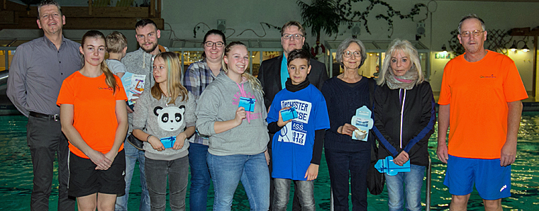 „Wir haben zehn Preise im Wert von über 600 Euro ausgeschrieben“, verkündet Ralf Kaufmann, einer der beiden Geschäftsführer der Bäder GmbH, bei der Preisübergabe am Wochenende im Alsfelder Hallenbad. „Unserer Glücksfee Melina haben Sie es zu verdanken, dass Sie heute zu den glücklichen Gewinnern gehören.“ Und glücklich schienen sie tatsächlich zu sein, denn die Freude war groß, als die Namen und das Gewonnene aufgerufen wurden.
