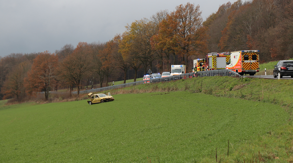Am Sonntag gegen 12.00 Uhr kam es zu einem Verkehrsunfall mit vier verletzten Fahrzeuginsassen auf der Landesstraße 2790 zwischen Motten und Döllbach. Ein 29-jähriger Fuldaer fuhr in einem gelben VW Golf von Motten Richtung Döllbach. Vermutlich aufgrund nicht angepasster Geschwindigkeit auf regennasser Fahrbahn und eines Fahrfehlers geriet das Fahrzeug im Bereich einer Linkskurve ins Schleudern. Es kam schließlich nach links von der Fahrbahn ab und fuhr dort auf eine beginnende Leitplanke. Dadurch wurde der VW Golf in die Luft katapultiert und schlug etwa 20 Meter weiter in einem angrenzenden Feld ein.