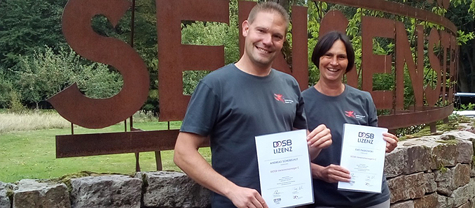 Sichtlich erfreut über die Lizenz, v.l.: Andreas Scheibelhut, Pressesprecher des Sportkreises Fulda-Hünfeld und Elke Piaskowski, Leiterin der Sportkreis-Geschäftsstelle.