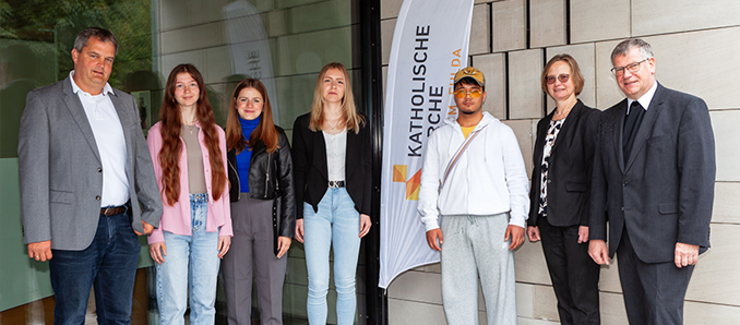 Gleich vier junge Menschen sind am Freitag in der zentralen Verwaltung des Bistums Fulda in ihr Berufsleben gestartet. Zu Beginn des neuen Ausbildungsjahres begrüßte Generalvikar Prälat Christof Steinert als Leiter der Bistumsverwaltung gemeinsam mit Ausbildungsleiterin Walburga Knüttel und dem Abteilungsleiter Personalentwicklung, Marcus Henning, die neuen Auszubildenden zur Verwaltungsfachangestellten Malin Kumpe und Marie Schiebelhut sowie die FOS-Praktikanten Laura Grimm und Omid Akbari in der Dienstgemeinschaft des Bischöflichen Generalvikariats in Fulda.