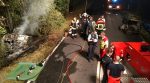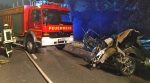 Romrod. Bei einem Verkehrsunfall nahe Romrod verloren am Samstagmorgen zwei Menschen ihr Leben. Sie kamen mit einem Auto auf der Bundesstraße 49 in Richtung Schellnhausen von der Fahrbahn ab und prallten frontal gegen einen Baum. Durch den Aufprall schleuderte das Fahrzeug gegen einen weiteren Baum und brach in zwei Teile, dabei ging die Fahrzeugfront in Flammen auf. Für die Insassen kam jede Hilfe zu spät, sie verbrannten im Unfallwrack. Feuerwehrleute aus Romrod löschten das lichterloh in Flammen stehen Auto ab, zur Unterstützung kam auch ein Tanklöschfahrzeug der Alsfelder Feuerwehr zum Einsatz. Nachdem ein Gutachter die Unfallstelle dokumentiert hatte, wurden die beiden Unfallopfer mit hydraulischen Geräten geborgen. Wie ein Feuerwehrsprecher informierte, gestaltete sich die Bergung sehr schwierig. So mussten unter anderem ein Autokran eingesetzt werden sowie ein Baumstamm mit einer Motorsäge vom Unfallwrack geschnitten werden. Während der Bergungsarbeiten war die Bundesstraße für fünf Stunden voll gesperrt. Die Identität der Verunfallten ist noch unklar und wird derzeit von der Polizei ermittelt. +++ pw