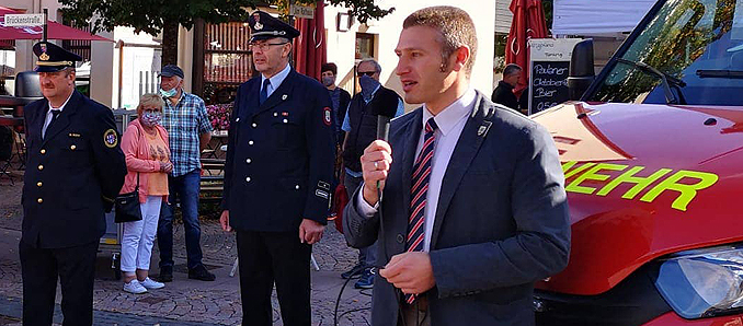 Im Anschluss an die Grußworte des Kreisbrandmeisters und der Wehrführungen hielten Pfarrer Reinhart Wachter (Ev.-luth. Kirchengemeinde) und Manfred Weinig, der die katholische Kirchengemeinde vertrat, eine Andacht und beendeten diese mit einem Segen der Feuerwehrkameradinnen und Kameraden. Bürgermeister Dr. Korell entließ nach der Schlüsselübergabe die Mitglieder der Feuerwehr mit dem Wunsch einer stets unfallfreien Fahrt und wohlbehaltenen Rückkehr von vielen lehrreichen Übungen und hoffentlich wenigen Einsätzen. Er rief dazu auf, die Feuerwehr und andere Rettungsorganisationen zu unterstützen: „Freiwillige Hilfeleistung kann nur funktionieren, wenn es genügend Menschen gibt, die sich in oder für eine Rettungsorganisation engagieren. Tun Sie dies, werden Sie aktives Mitglied in einer Einsatzabteilung oder unterstützen sie diese durch Mitgliedschaftsförderung der Feuerwehrvereine.“ Untermalt wurde der Festakt durch musikalische Darbietungen des Posaunenchors. +++