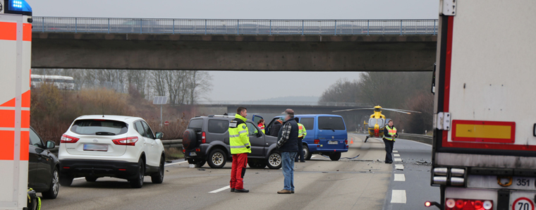Unmittelbar an der Anschlussstelle Fulda-Mitte kollidierten am Samstagvormittag zwei Pkw bei einem Überholvorgang. Ein nachfolgender Kleinbus konnte nicht mehr rechtzeitig bremsen und krachte in die Unfallfahrzeuge. Ein Insasse wurde schwer, zwei weitere Personen leicht verletzt. Aus noch ungeklärter Ursache kollidierte ein Opel Corsa mit einem rechts neben ihm fahrenden Suzuki Jimmy und krachte weiterhin in die Mittelleitplanke. Der Kleinwagen wurde dabei völlig zerstört, der Fahrer schwer verletzt. Der Suzuki wurde auf der Fahrerseite beschädigt, der Kleintransporter kollidierte offenbar im Anschluss mit dem Corsa. Die Unfallstelle erstreckte sich über rund 50 Meter, die Autobahn wurde dementsprechend zwischen Fulda-Mitte und Fulda-Nord in Richtung Norden voll gesperrt. Der Verkehr konnte an der Anschlussstelle abgeleitet werden, dennoch entstand ein erheblicher Rückstau. An der Einsatzstelle landete auch der Rettungshubschrauber Christoph 28, um den schwer verletzten in eine Klinik zu fliegen. Zum Glück war der Patient aber in dem Wrack nicht eingeklemmt, sodass keine Feuerwehr benötigt wurde. +++