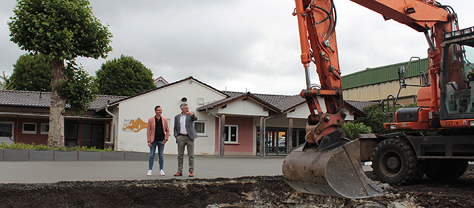 „Weiter geht’s!“, kommentiert Landrat Manfred Görig (SPD) den Beginn des nächsten Bauabschnitts auf dem Schulhof. Beim Besuch koffert die Baufirma gerade den Unterbau für die Schulhoffläche aus, die als Teil der Feuerwehrzufahrt ausreichend stabil sein muss. Im direkten Anschluss zur schon im vergangenen Jahr fertiggestellten Fläche ist nun der zweite Bauabschnitt an der Reihe. Gemeinsam mit Schulleiter Angelo Müller, Peter Schwärzel, zuständiger Amtsleiter vom Amt für Hochbau, Energie und Gebäudewirtschaft (AHEG), sowie Mitarbeiter Jens Salzmann besichtigt Landrat Görig die Baustelle.